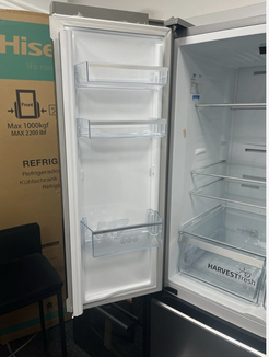 This stylish Freestanding American Style Fridge Freezer features AeroFlow™ technology, which minimises temperature fluctuations to keep food fresher for longer. Inside the crisper drawers, HarvestFresh™ uses innovative three-colour light technology to help preserve essential vitamins in your fruit and vegetables. With a generous 510-litre capacity—enough space for up to 28 bags of fresh and frozen shopping—it’s the ideal choice for large households and busy kitchens.