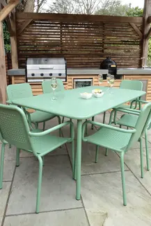 Setting up an outdoor dining room is garden goals. This will provide a delightful place to host lunches and dinners, and its sheer heaven to eat breakfast outside on a spring and summer day. Whether you opt for an outdoor dining garden furniture set which boasts a dining table and armchairs for a smart, cohesive look or a table set with foldable, stackable or reclining seats for practicality and space saving. We have many dining garden furniture sets available from a range of materials such as rattan, rope effect, aluminium, responsibly sourced wood and 100% recyclable plastic.
