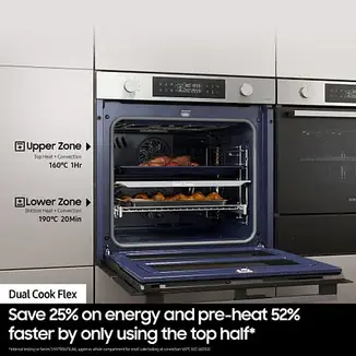 Discover amazing culinary results with the Samsung NV7B45305AK Single Oven DualCook Flex Built In Black. Enjoy the Samsung Dual Cook Flex Technology that divides the oven into two independent cooking zones with their own temperature settings, allowing you to cook different dishes at the same time. Get total control over your cooking with precise temperature settings and multiple cooking modes. Achieve perfect results every time.